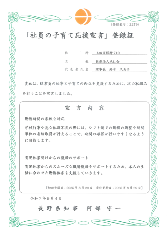 医療法人光仁会は、長野県が運営する「ながのけん社員応援企業のサイト」における「社員の子育て応援宣言」登録企業として掲載されました(登録番号:2279)。県公式ページには当法人の宣言内容が公開されています。