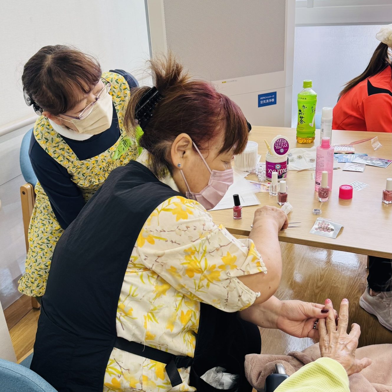 全ての指に塗り終わると、利用者様の表情がぱぁっと明るくなり、「手元が明るいと元気が出る!」と、その光景を見ていた私達も元気をもらいました。