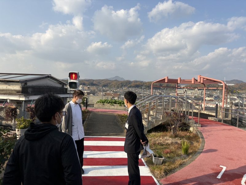 4階の屋上には眺望のよい庭園が広がっており、利用者様が在宅復帰を見据えた「実用的な歩行練習」ができる工夫が随所に見られました。