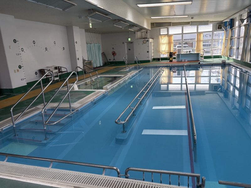 施設内には屋内プールが整備されており、疾病予防施設・通所・入所の利用者様がそれぞれの状態に合わせて利用できるようになっていました。