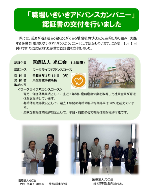 令和8年1月13日、当法人にて「いきいきアドバンスカンパニー ワークライフバランスコース」交付式が執り行われました。