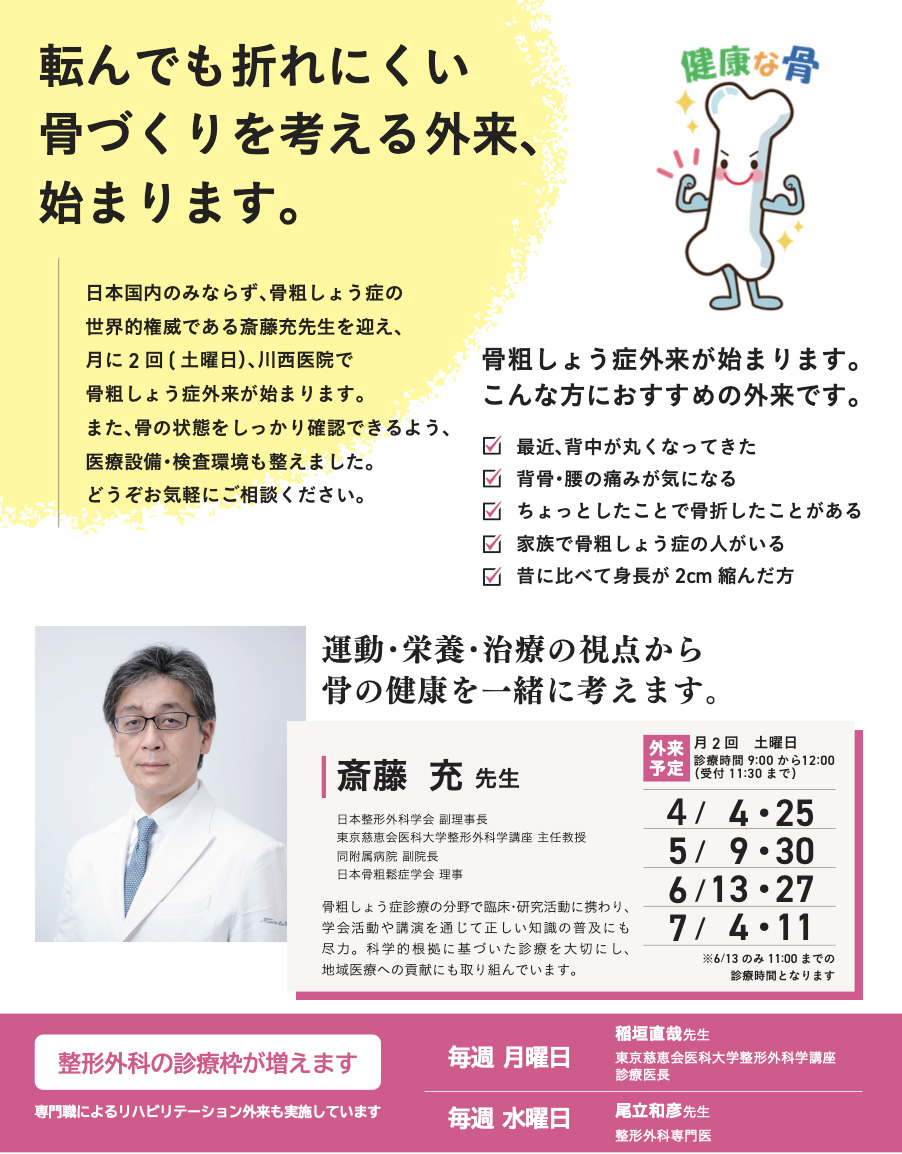 日本国内のみならず、骨粗しょう症の世界的権威である斎藤充先生を迎え、月に2回(土曜日)、川西医院で骨粗しょう症外来が始まります。